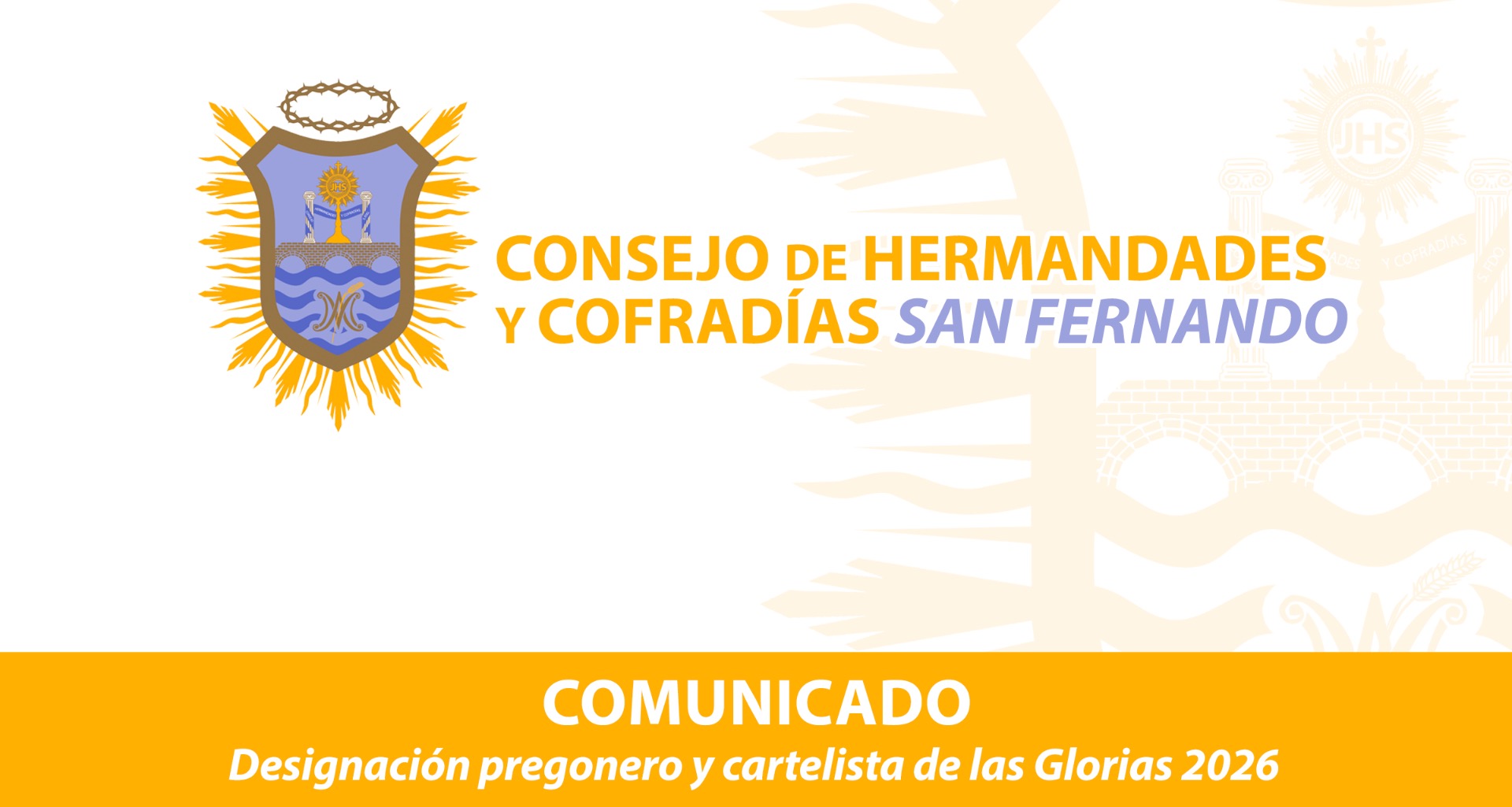 La Junta Permanente del Consejo Local de Hermandades y Cofradías de San Fernando, reunida en sesión ordinaria en la jornada de hoy, informa de manera oficial que se han realizado las designaciones correspondientes de cara al próximo tiempo de Glorias 2026.