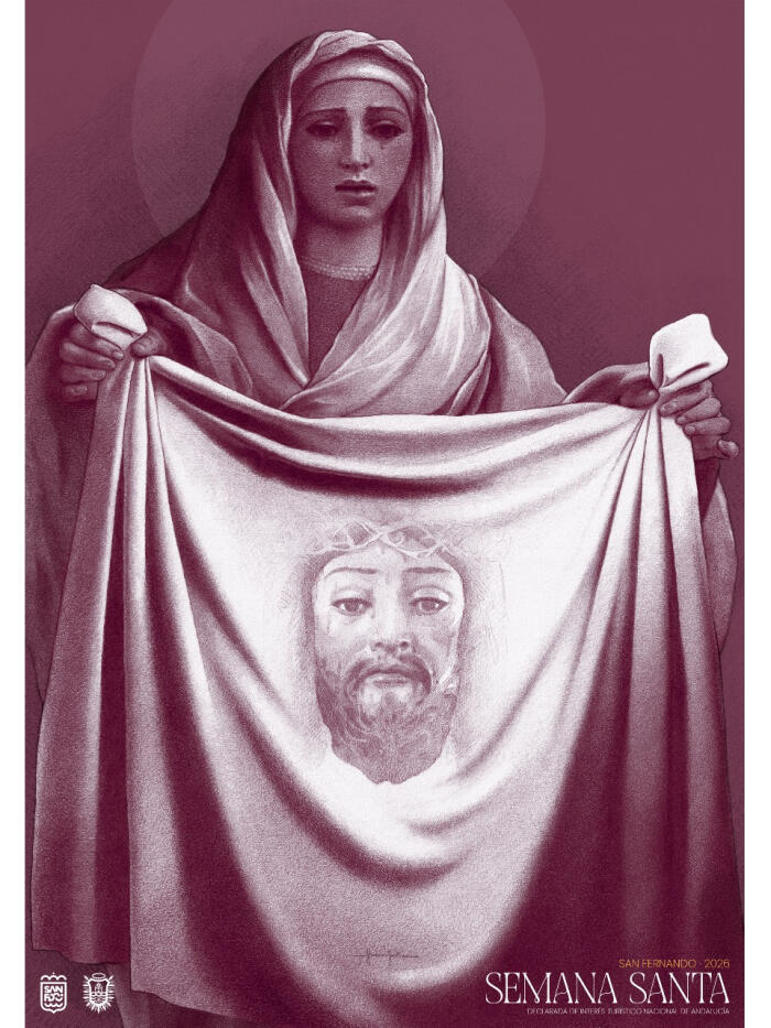 El cartel nos muestra a la Santa Mujer Verónica sostiendo el paño con la imagen de Nuestro Padre Jesús Nazareno, regidor perpetuo de San Fernando. A nivel técnico, la obra bebe del tenebrismo y los claroscuros propios del Barroco. Los dibujos que componen el cartel están realizados a grafito sobre papel, mientras que el uso del color y la composición final se han desarrollado mediante técnicas digitales. La gama cromática, dominada por tonos vino tinto, alude simbólicamente a la sangre de Cristo, estableciendo un vínculo directo con el significado del velo con el que la Verónica enjugó el rostro del Señor durante su camino al Calvario.