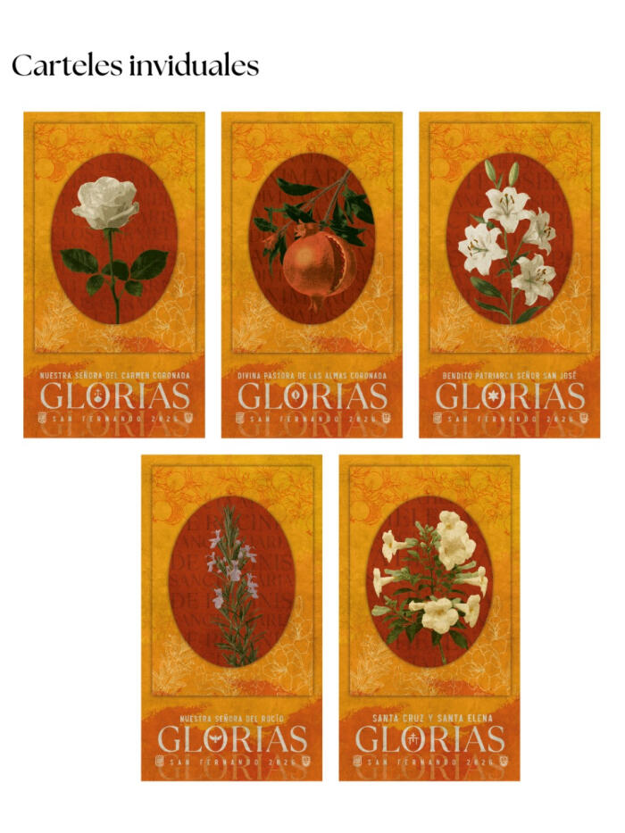 La obra se completa con una serie de carteles individuales que mantienen la misma estructura, color y lenguaje gráfico. En ellos, el óvalo central se transforma en símbolo: cada advocación se representa a través de un motivo floral o frutal que condensa su significado.
